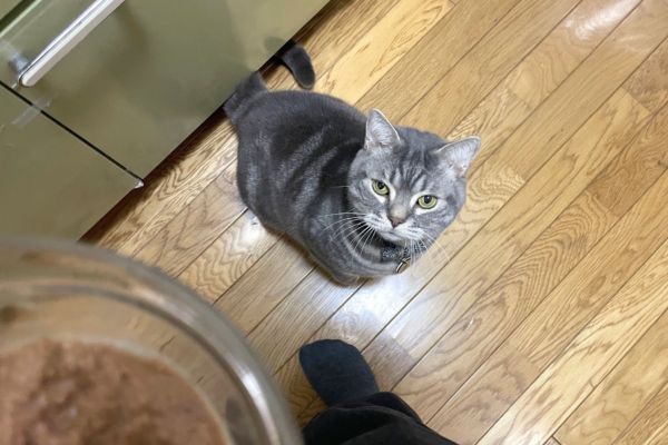 準備中、キッチンまでやってきて私の足にこつんこつんと頭をぶつけて「ンニャー」と催促する猫ちゃん。
